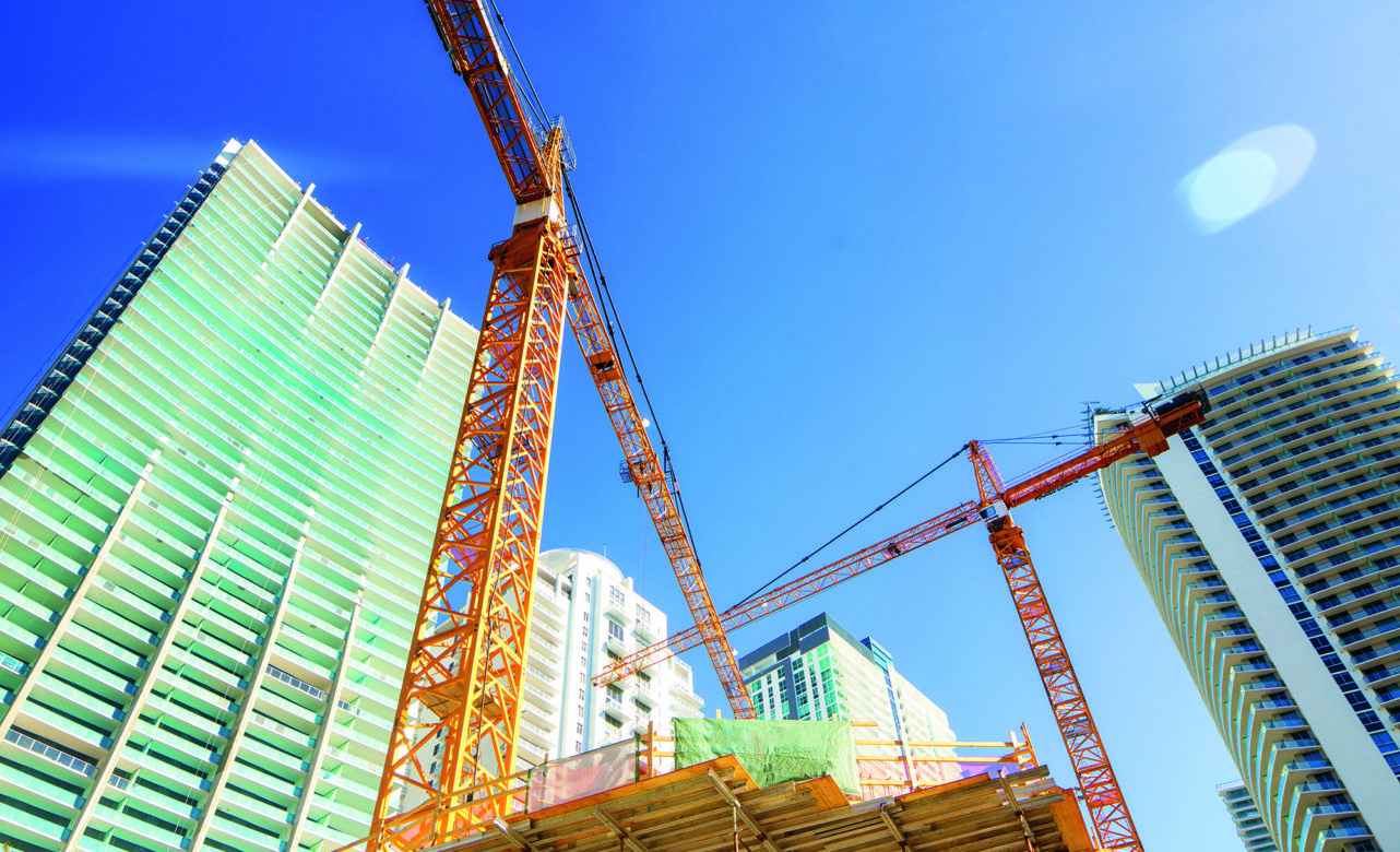 Miami Brickell modern skyscrapers under construction with cranes and lens flare.